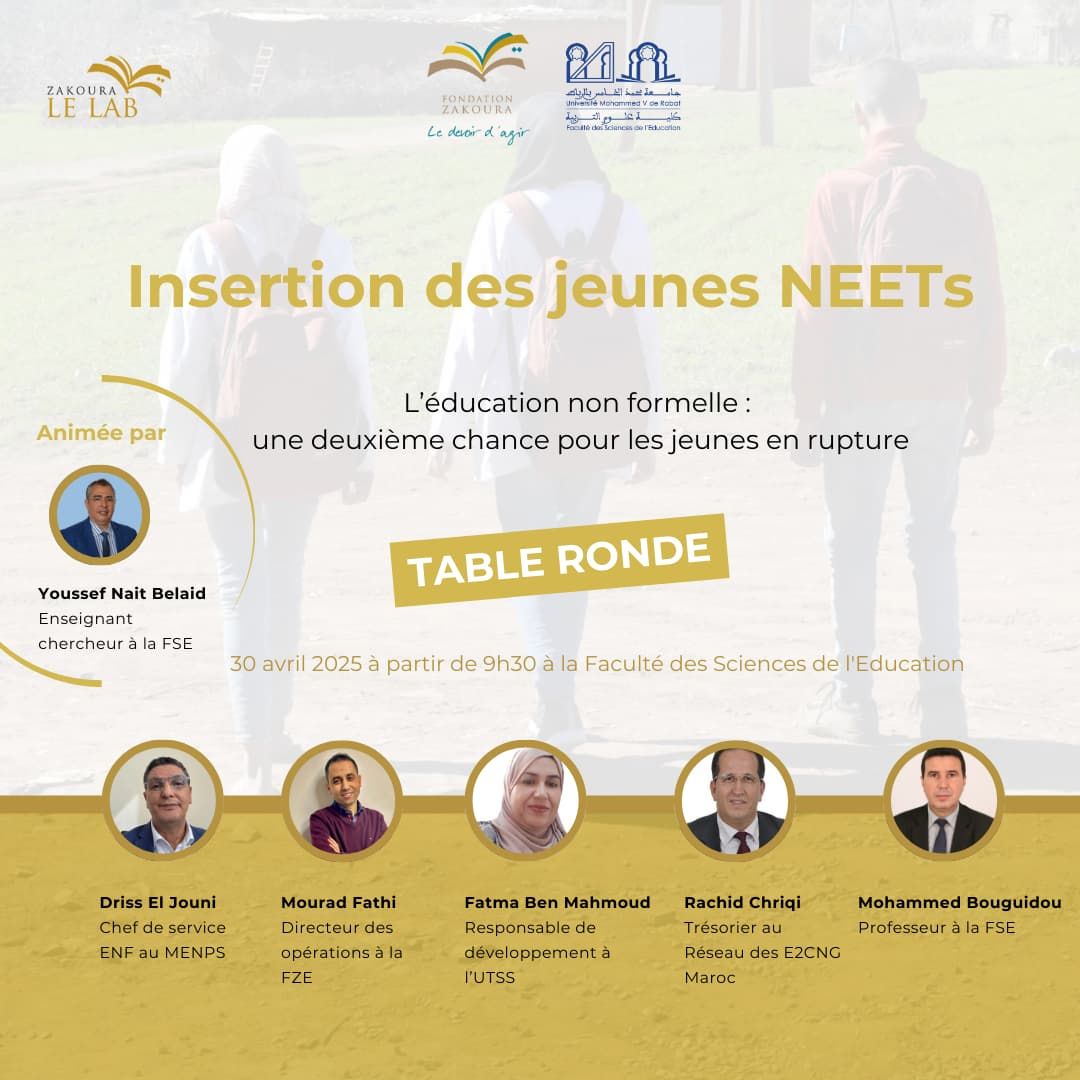 Le 30 avril 2025, j’ai eu le plaisir d’animer une table ronde internationale à la Faculté des Sciences de l’Éducation (FSE) de Rabat, autour d’une thématique qui fait partie de mes centres d’intérêt en recherche scientifique et en expertise : « L’éducation non formelle : une deuxième chance pour les jeunes en rupture ».